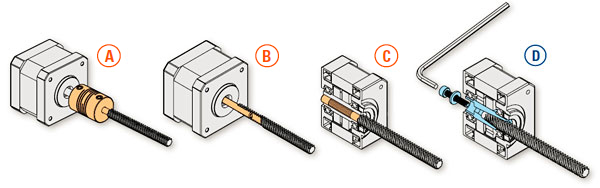 將電機固定到梯形絲杠上通常需要耦合器總成 (A)、沉孔壓配合 (B) 或空心軸壓配合 (C)。 組裝流程可能還需要使用 粘合劑或焊接,但結(jié)果就是所有這些解決方案將造成難以或無法更換梯形絲杠 或進行維護。 通過正在申請專利并只需要一個固位緊固件的錐形鎖套耦合器 (D),Thomson 已成功解決這一問題。 您可利用這項全新設(shè)計輕松進行維護或梯形絲杠的更換。